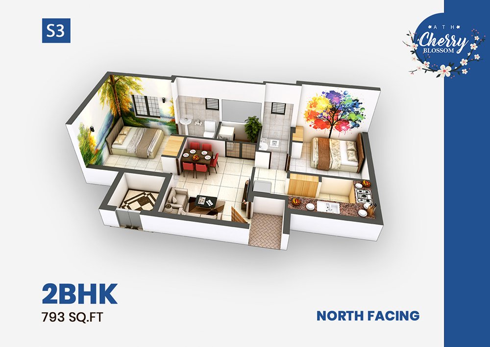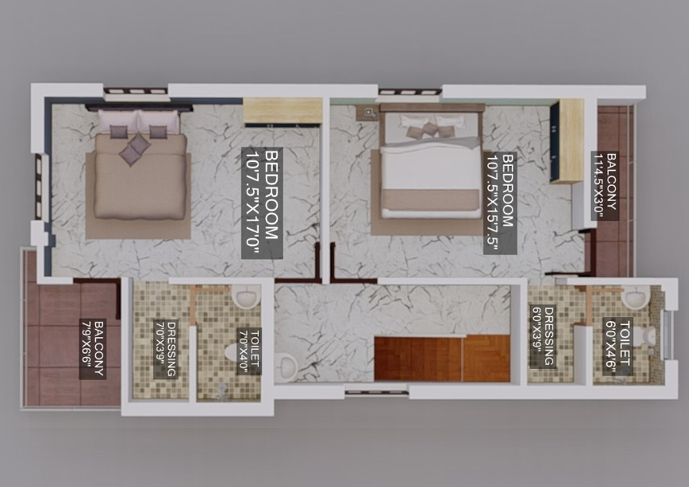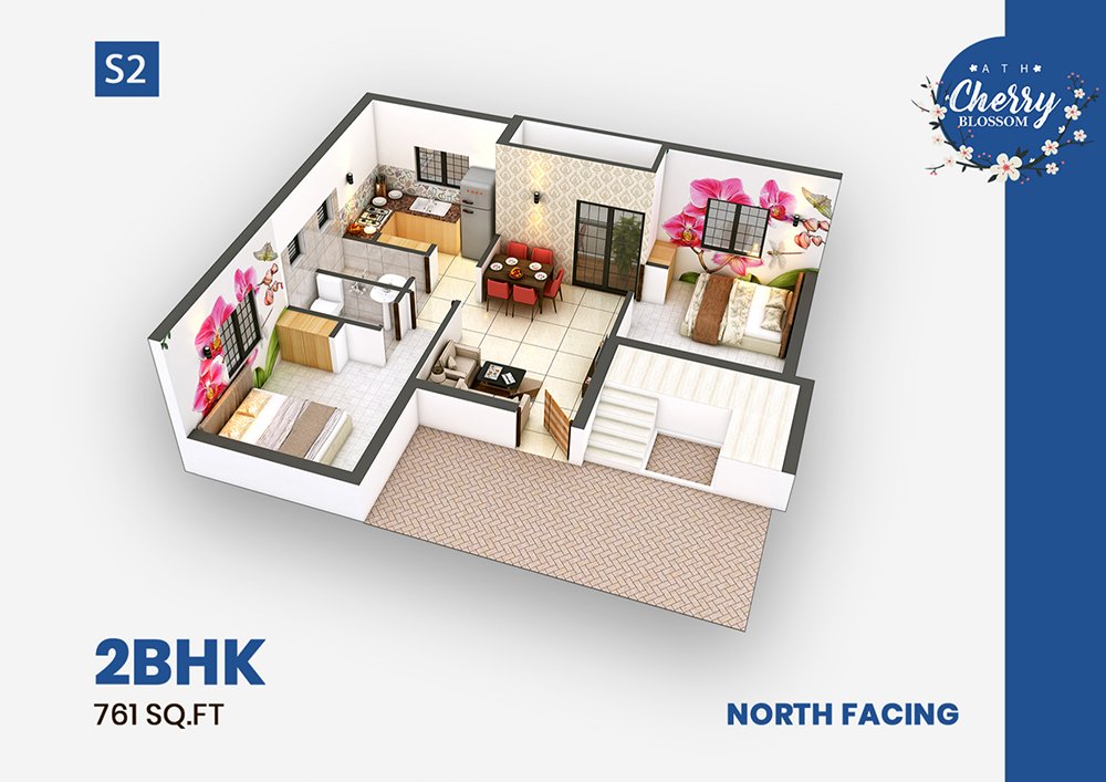 Flooring in Living, dining, kitchen and bed room will have 4x2 vitrified tiles.